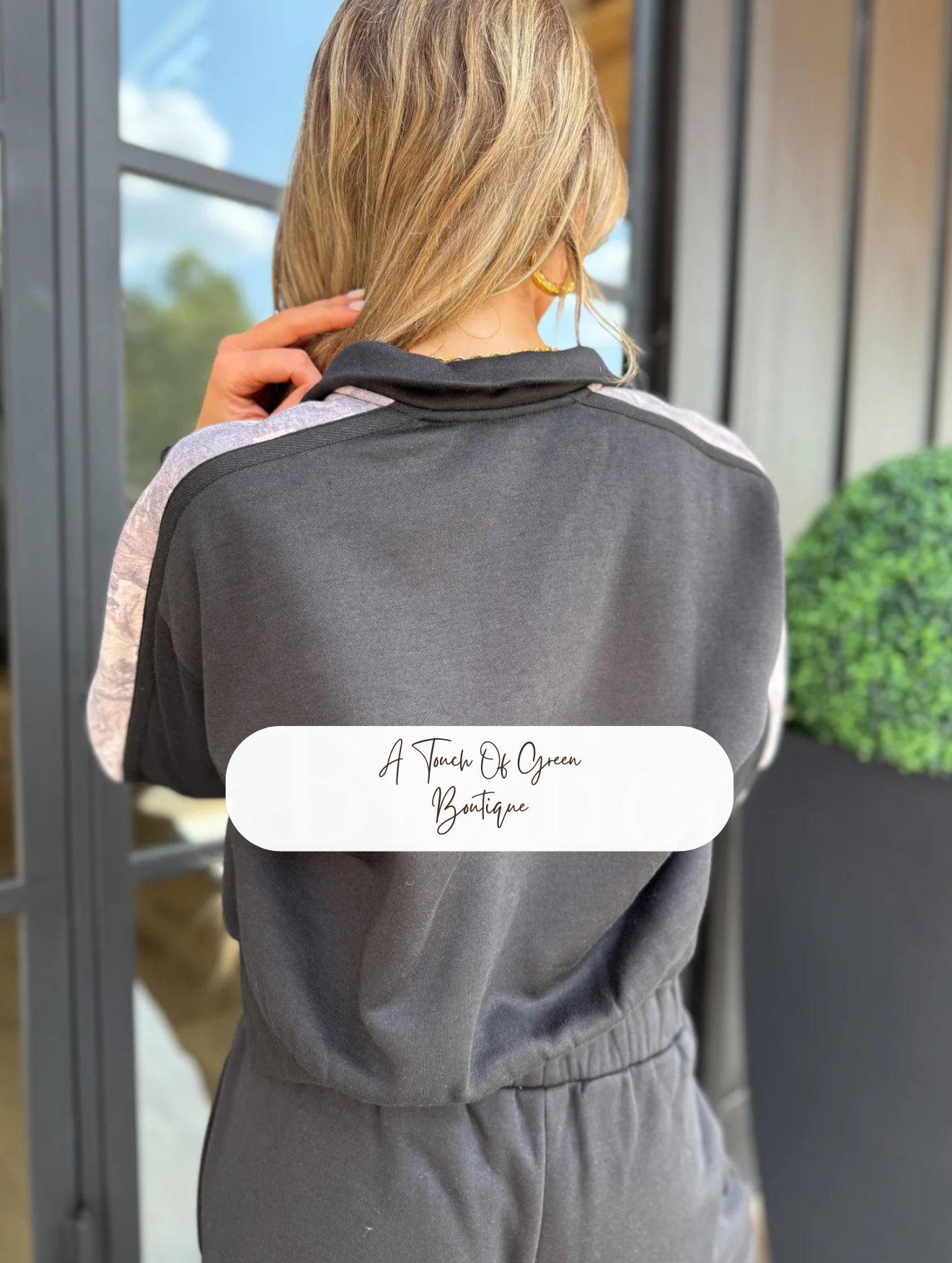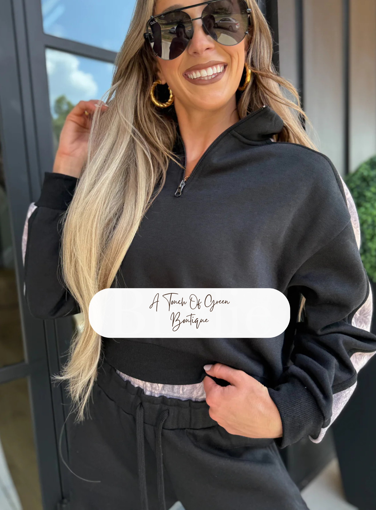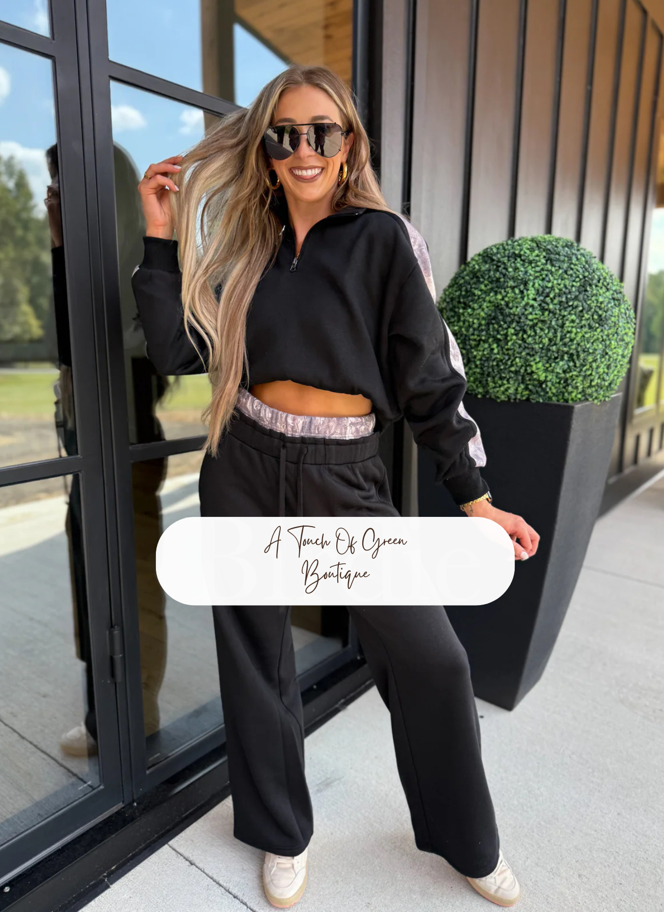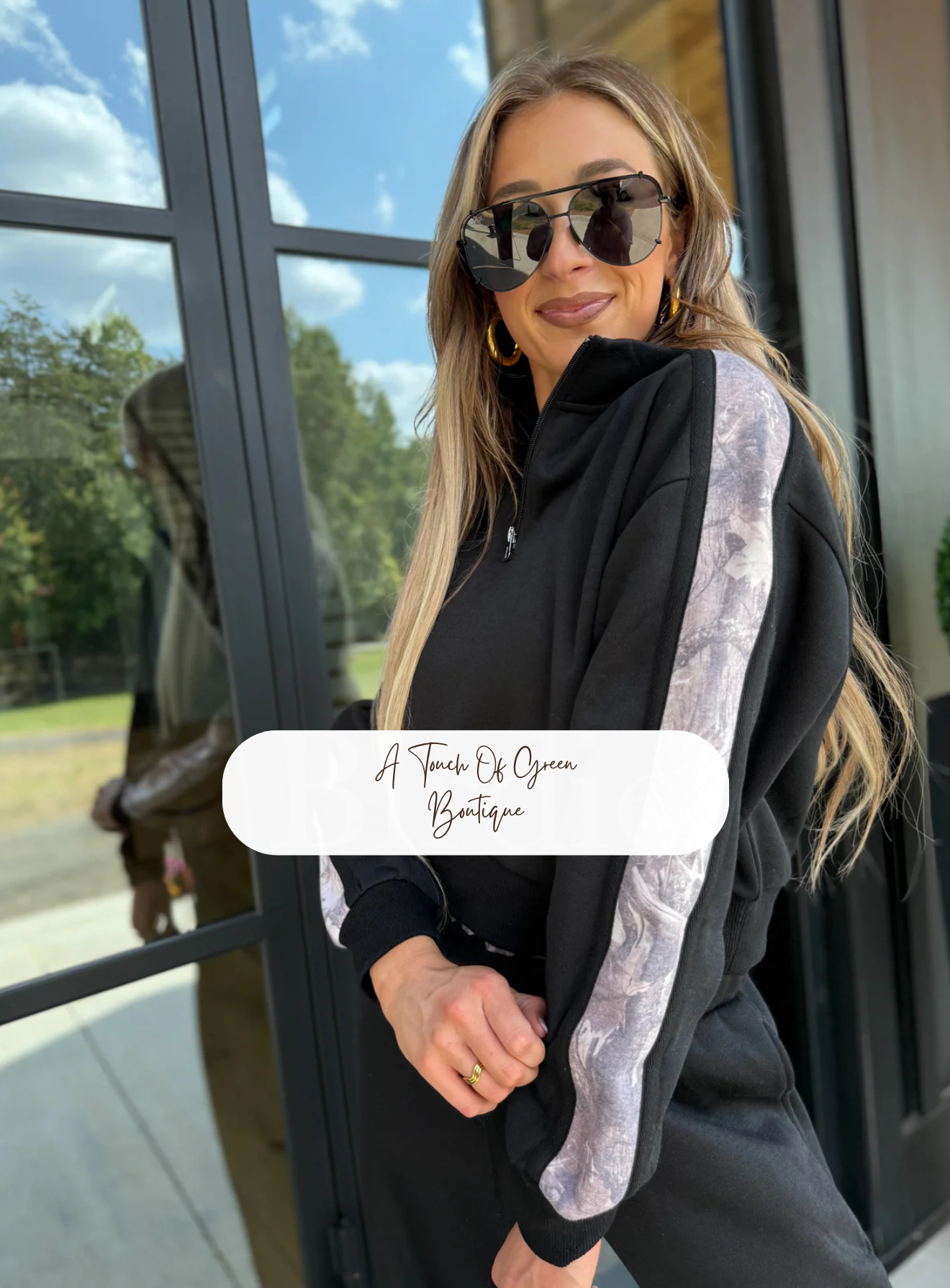 Effortless style meets everyday comfort in this sleek two-piece black set. Camo along the arm of the top and waist band of the pants.